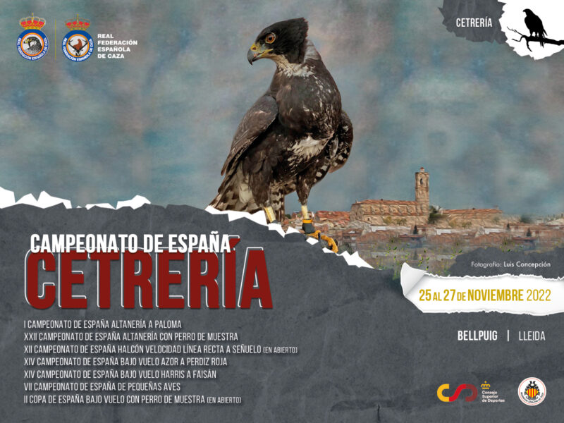 El municipio ilerdense de Bellpuig acoge del 25 al 27 de noviembre el Campeonato de España de Cetrería 2022, para las modalidades de Altanería a Paloma Lanzada, Altanería con Perro Muestra, Bajo Vuelo Azor a Perdiz Roja, Bajo Vuelo Harris a Faisán, Pequeñas Aves, Halcón Velocidad en Línea Recta a Señuelo y la Copa de España de Bajo Vuelo con Perro de Muestra.
