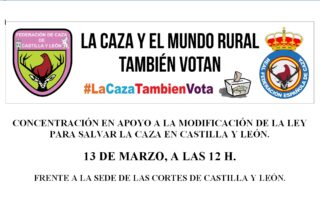 La Federación de Caza de Castilla y León convoca a todos los cazadores y a quienes quieran manifestar su apoyo a la caza en la región, el próximo miércoles 13 de marzo, a partir de las 12 h, frente a la sede de las Cortes de Castilla y León (Plaza de las Cortes de Castilla y