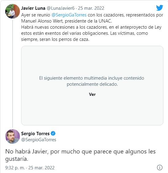 Sergio en cuestión, después de ver la que había provocado la Ley en forma de manifestación, al fin decidió “reunirse” con los cazadores (llevamos 3 años pidiendo reuniones para que se elabore una ley con nosotros, no contra nosotros y el medio rural sin éxito), lo curioso es que se ha reunido con la UNAC, una entidad privada y que no representa a nadie salvo a sus intereses, a los cuales ha mentido diciendo que la Ley no afecta a la caza, pero ante estas afirmaciones los propios animalistas le dicen que eso va en contra de lo que predica, y les tranquiliza afirmando que a los cazadores concesiones… “no las habrá”, así nos lo contó Jara y Sedal, Sergio García desmiente a la UNAC y dice que no habrá concesiones a los cazadores en la Ley de Bienestar Animal