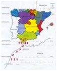 CÓMO SE PRESENTA EL CAMPO.- Cada año las codornices nos visitan por las mismas fechas. Solamente en Castilla y León me han dado noticias de haberse oído cantar en Alaejos y Burgos a primeros de abril. En Valladolid me desgañito a reclamar, pero no aparece ni contesta nadie. No está el campo en condiciones pues no ha crecido en ninguna zona hasta 15 cm en la siembra tardía y la temprana también muy ruin. Las fechas históricas de visita de los primeros machos cantando al campo, son las que reflejamos en diferentes paralelos en el plano siguiente. También marcamos en él una estimación de la sex-ratio de las codornices de llegada. A medida que subimos van quedándose en el campo las hembras anidando y los machos siguen hacia el norte buscando aventura. Salen las poblaciones migradoras con una relación de sexos M/H de 1:1 aproximadamente y al irse quedando hembras van aumentando ese cociente que en Cataluña estimaban ya era de H/M= 5. Está escrito que en Suecia, última estación de la ruta codornicera, el número de machos era doce veces superior al de hembras; así que pillar allí una novia está muy pagado y difícil.
