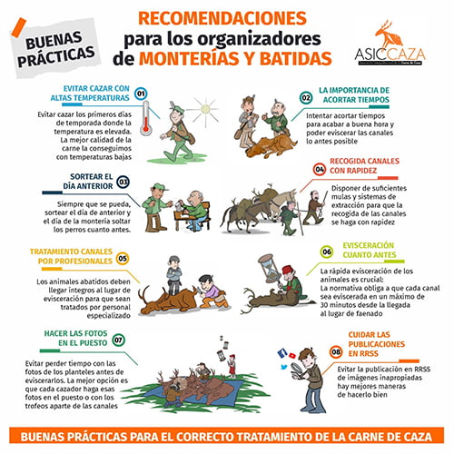 Las primeras recomendaciones dirigidas a los organizadores de monterías y batidas están enfocadas en la planificación. Evitar cazar con temperaturas altas, acortar los tiempos para acabar a buena hora y eviscerar las canales lo antes posible, o sortear el día anterior para aprovechar mejor el tiempo el día de la montería son algunos de los consejos de ASICCAZA.