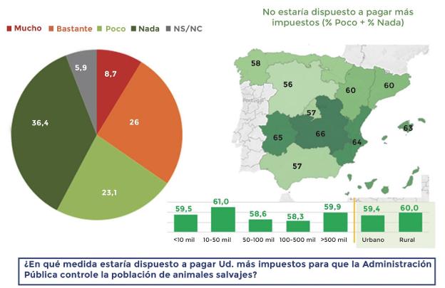 Entre los principales resultados del estudio destaca que más del 60 % de los españoles coinciden en que no están dispuestos a pagar más impuestos para que la Administración Pública se haga cargo del control de poblaciones de fauna silvestre y, además, el 71 % de los encuestados se posiciona a favor de utilizar la caza para llevar a cabo ese control.