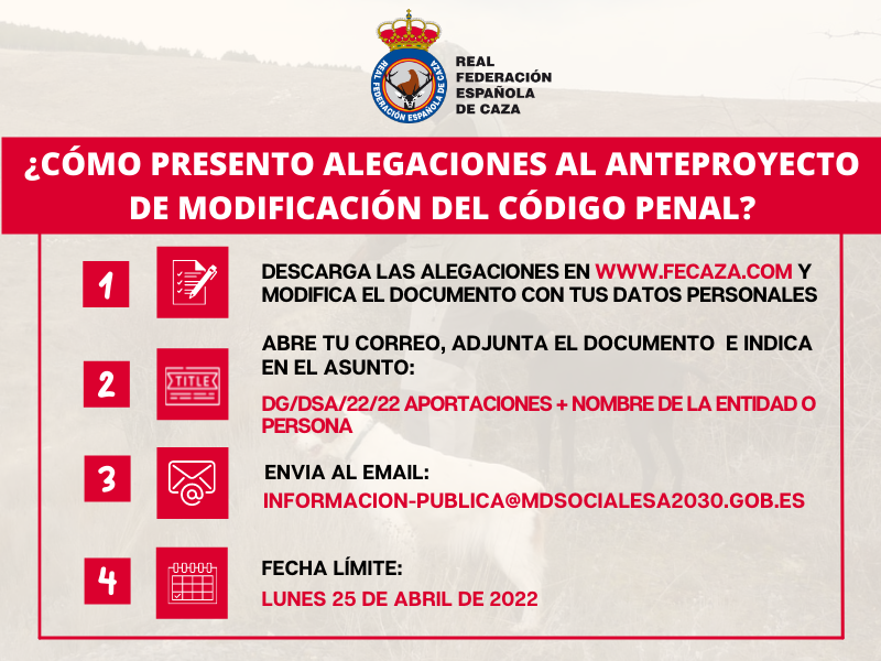 Junto a estas alegaciones la RFEC ha puesto a disposición de todos los cazadore y personas que quieran tumbar el proyecto una modelo de alegaciones para que, a nivel articular y atendiendo a su legítimo derecho, puedan presentarlas ante el ministerio de Derechos Sociales y Agenda 2030 hasta las 00:00h del 26 de abril.