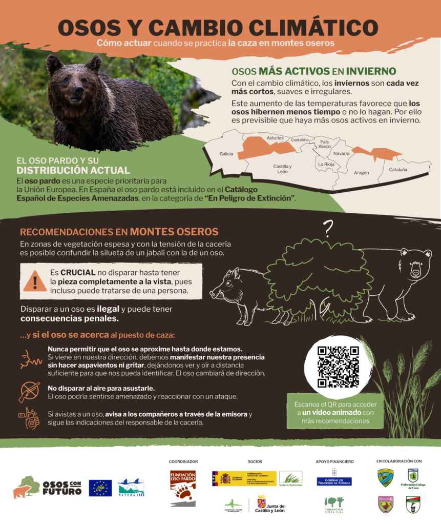 - Las Federaciones de caza de Galicia, Asturias, Cantabria y Castilla y León, la Fundación Biodiversidad del Ministerio para la Transición Ecológica y el Reto Demográfico (MITECO) y la Fundación Oso Pardo, presentaron ayer una campaña informativa dirigida al sector cinegético compuesta por un video animado, una infografía y encuentros con representantes del sector
