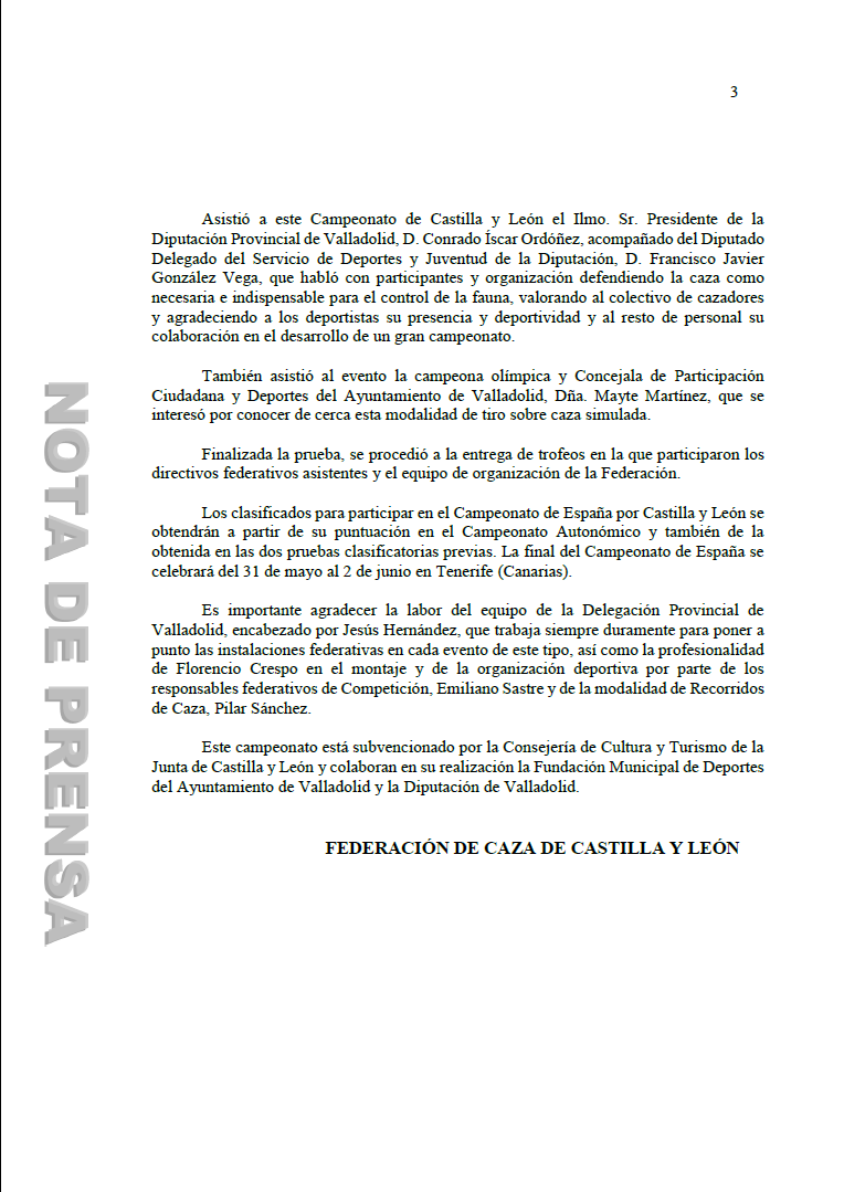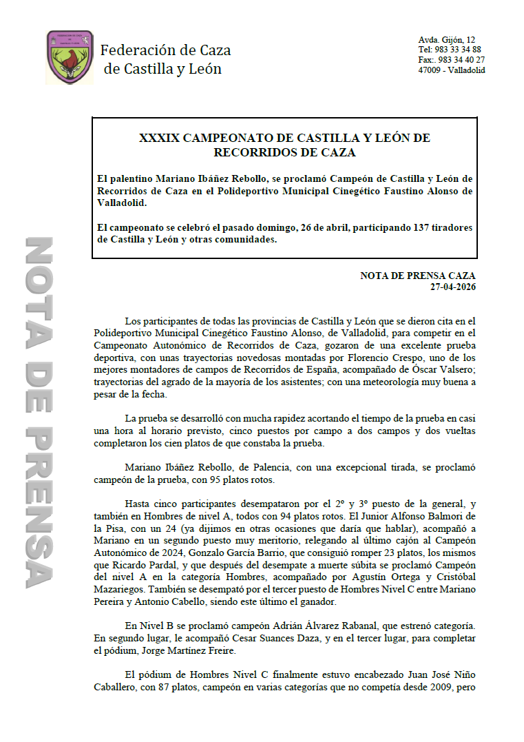 XXXIX CAMPEONATO DE CASTILLA Y LEÓN DE RECORRIDOS DE CAZA, NOTA DE PRENSA View Larger Image Oscar Hernandez 2026-04-29T13:18:41+02:00 29 abril, 2026|Actualidad Federativa| Compártelo en las redes sociales FacebookTwitterLinkedinGoogle+PinterestEmail Noticias relacionadas El Parlamento Europeo aprueba un reglamento de trazabilidad de perros y gatos con impacto en el sector cinegético 29 abril, 2026 XXXIX CAMPEONATO DE CASTILLA Y LEÓN DE RECORRIDOS DE CAZA, NOTA DE PRENSA 22 abril, 2026 Increíble participación en el campeonato provincial de RRCC de Zamora 21 abril, 2026